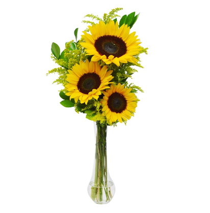 3 Lindos Girassóis em um delicado vaso de vidro para presentear a qualquer momento quem você gosta.